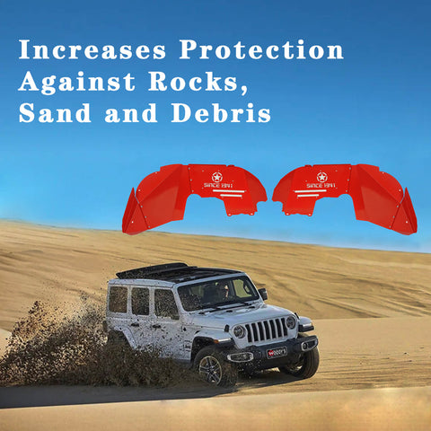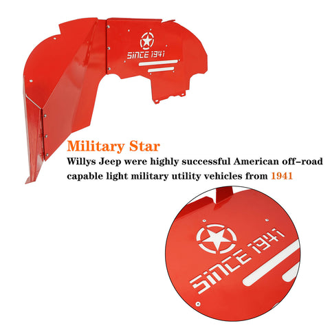 Solid Construction. These front Inner Fenders feature a solid steel construction that gives it exceptional durability ideal for rough off-road driving. A vivid glossy red powder coat finish is applied to give the inner fenders liners increased resistance to corrosion and rust.