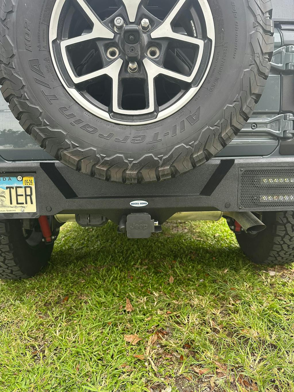 Protection and Recovery. The Hooke Road Aftermarket Rear Bumper for Jeep JL seamlessly blends form and function, presenting a classic design with outstanding protective features. This rear bumper not only complements the vehicle's aesthetics but also ensures excellent defense for the rear, making it ideal for both on-road elegance and off-road resilience. The driver's side of the bumper incorporates a license plate mounting plane, accompanied by a license plate light, emphasizing both practicality and regulatory adherence. Additionally, the bumper boasts 2×18W horizontal LED spotlights adorned with honeycomb steel mesh, contributing to a refined and sophisticated appearance. With features like a D-ring mount equipped with a sturdy 9,500 lbs rated D-ring, along with a class Ⅲ 2" standard hitch receiver, this bumper is not only stylish but also highly functional, accommodating various needs.