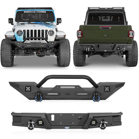 Feature Compatible with 2020-2024 Jeep Gladiator JT Models Bumper weight: about 57 lbs Features an aggressive bull bar Equipped with 2×25W white square LED spotlights and 2×18W white horizontal L...