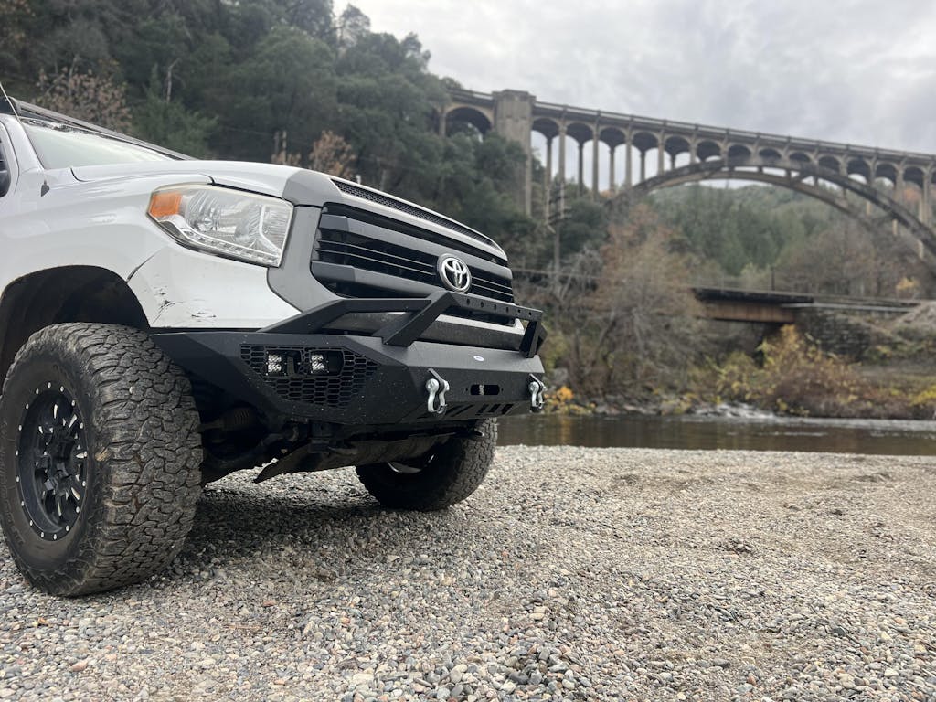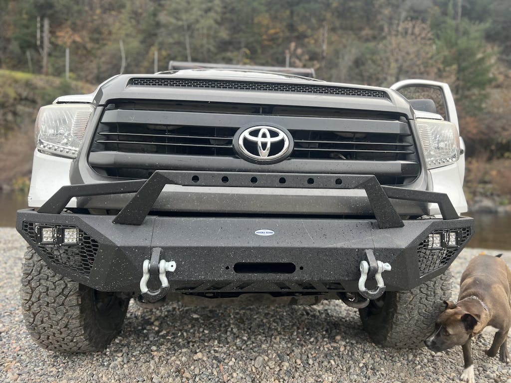 Solid Construction. Designed for a bolt-on installation, this front bumper is CNC-cut, formed, and MIG/TIG-welded to perfectly fit on your Tundra. The provided stinger adds extra protection against forwarding impacts on steep terrain.