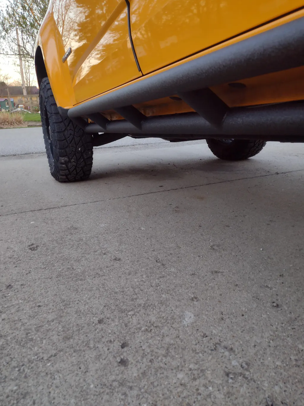 Heavy Duty Construction. Fabricated from robust 1.9" diameter x 0.06" thick steel tubing, these Tube Slider Rocker Guards boast exceptional strength. The textured black powder coat finish not only enhances their rugged appearance but also provides effective corrosion resistance. Employing a premium E-coating process on the interior ensures long-lasting durability against various elements. This combination of thick steel tubing and advanced coatings not only fortifies your Tacoma against off-road challenges but also adds a sleek, textured finish.