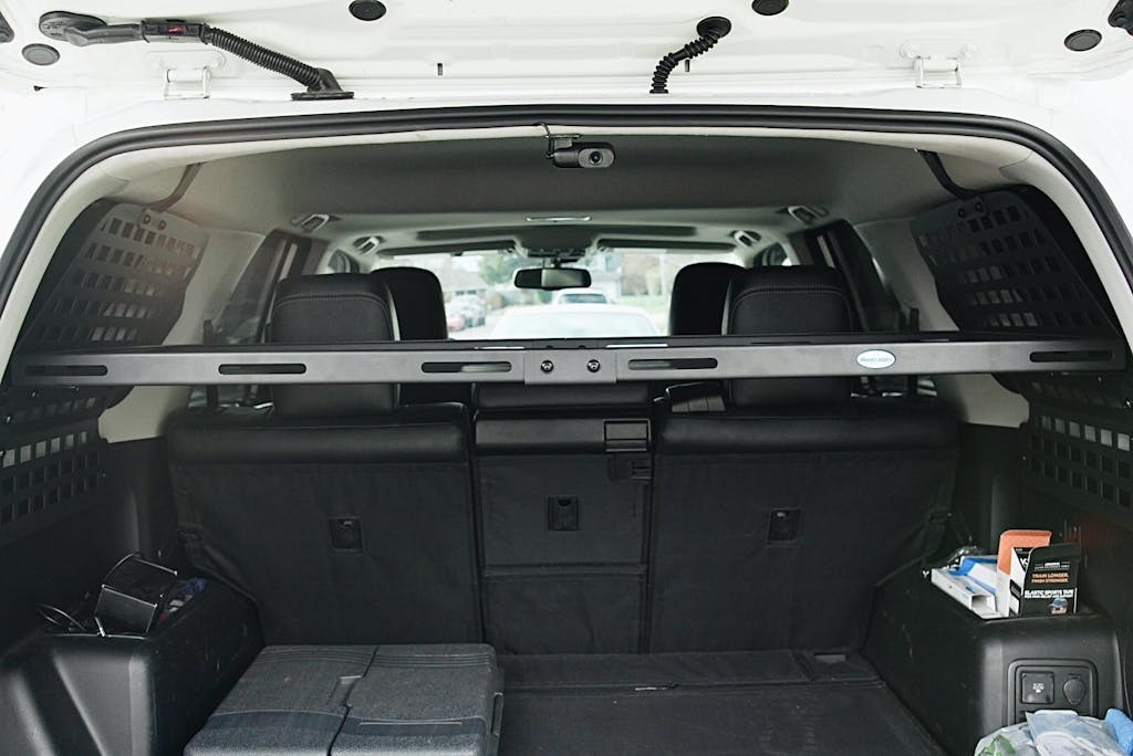 Installation. The installation process for the Rear Window Molle Panel & Interior Cargo Rack Kit is straightforward, employing a direct bolt-on mechanism. The panels are strategically placed around the rear window and aligned with the factory mounting points. It's essential to note that for 7-seater Toyota 4Runners, the 3rd row must be permanently folded down. This user-friendly installation makes the kit an accessible and valuable enhancement for those seeking an efficient and stylish solution to maximize their vehicle's storage capacity. You should expect to take up to 1 hour to install this unit, based on your level of mechanical skills.