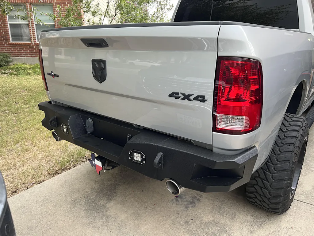 • Dodge Ram 1500 Rear Bumper: Bumper weight about 65 lbs; 9500 lbs rated,3/4'' D-rings not included; Equipped with a License Plate Light; Heavy-duty 9 gauge(5/32 inch) steel construction; Integrated steps for easy access to bed; Retains factory receiver hitch; Not compatible with factory back-up sensors; 2 x 18w LED floodlights Included; Textured black powder coat finish; Rugged Styling and Protection abrasion