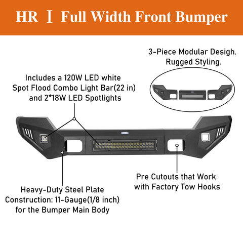 Protection and Style. Add spectacular protection to your front end with this Ford F-250 Full Width Front Bumper. This bumper is strong, but lightweight, and looks beautiful in the front of your Super Duty. There are a 120w high power LED flood spot combo light bar(22 inches) and 2×18w LED spotlights that provide adequate lighting at night for safe driving.