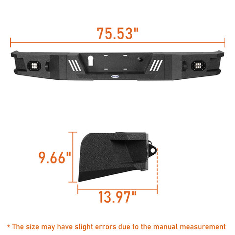 Bumper weight: about 115 lbs; Audacious, angular off-road design with hoop; Protects vehicles from on & off-road debris; Delicate hollowed-out honeycomb design in both sides; Includes a skid plate provides under-engine protection; Comes with a winch plate – only fits advanced wireless remote operate winch without a manual clutch handle. Rated up to 12,000 pounds; Not Compatible with Factory Sensors; Heavy-duty steel construction: 11-gauge(1/8 inch) plate for the bumper main body, 10-gauge(9/64 inch) steel plate for the winch plate; High strength D-Ring mounts welded both inside and out with 4.75-ton capacity. D-rings not included; Two-stage Finish: Textured black powder-coated finish