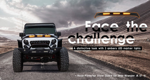 LED Running Lights. This Jeep JK Hood Protector also includes 3 amber LED running lights. These LED accent lights come with a wiring harness that simply splices into your Jeep Wrangler JK's existing factory ACC circuits. The LEDs will then automatically activate once you run the vehicle. The eye-catching LEDs not only look great but will also make your Jeep more visible to other drivers at night and in poor weather conditions.