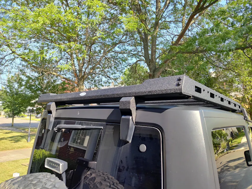 Are you looking for Jeep Roof Racks? The Hooke Road Overland Aluminum Roof Rack, compatible with Wrangler JK 07-18 Hard Top, is designed to enhance your outdoor adventures. This roof rack offers a sleek, slim, and minimalistic design while providing valuable extra exterior cargo space. It has a carrying capacity of up to 220 pounds (evenly distributed), making it perfect for carrying gear, equipment, and accessories on your off-road journeys. To improve aerodynamics and fit, it features a front wind fairing. The Jeep Wrangler roof rack is thoughtfully designed with built-in side panel slots, offering endless possibilities for adding accessories such as handles, side lighting, awning mounts, and more.